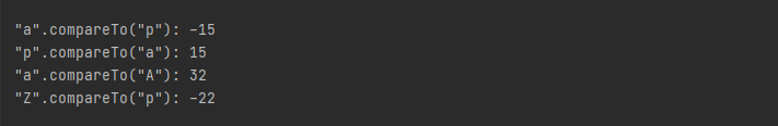 val alphaA_alphaUpperA = alphaA.compareTo(alphaUpperA)