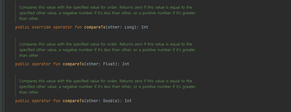 위에서 보이는 것처럼 compareTo는 Int, String 타입을 제외하고도 굉장히 많은 타입을 비교할 수 있다는 것을 확인할 수 있다. 하지만 여기선 Int와 String만 테스트해볼 예정이다.