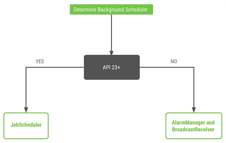 API 레벨 14로의 호환성을 보장하기 위해, WorkManager는 장치 API 수준에 따라 백그라운드 작업을 스케줄 하기 위한 적절한 방법을 선택합니다. WorkManager는 JobSchedule를 사용하거나 또는 BroadcastReceiver와 AlarmManager를 조합해서 사용할 수 있습니다.